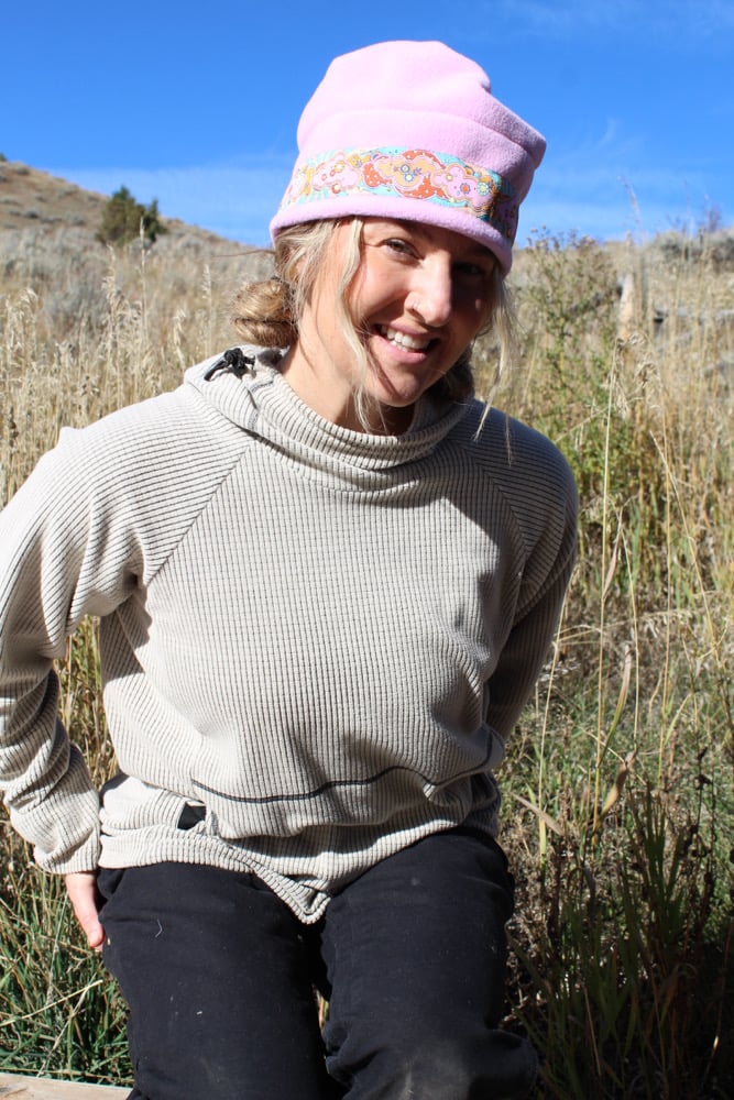 This specific style is the Spring Hat. This design features a cinch at the top so that the hat can convert into a neck gator and slide over your head. This is a lighter, more breathable hat because it is primarily single layered with only two layers of fleece on the fold.